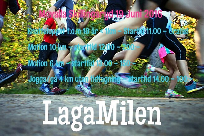 Man kan nu anmäla sig till LagaMilen. Det är vårt motionslopp som arrangeras av SIS fotboll Söndagen innan midsommarveckan - 19 juni 2016. Klasserna är: 10 km Motion Damer 200:- 10 km Motion Herrar 200:- 6 km Motion Damer 150:- 6 km Motion Herrar 150:- 4 km Jogga/Gå (ej tidtagning) 100:- Knatteloppet t.o.m 10 år <1 km Gratis! Klicka på menyvalet "Mer" uppe till höger för att komma till anmälan! Anmälningsavgiften betalas till plusgiro 739526-2 Vem skall bli först!